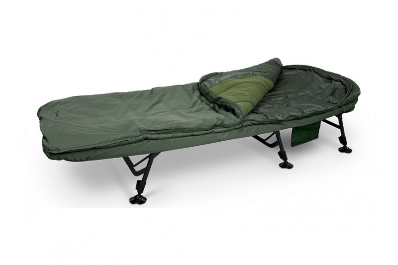 There is a fleece lined upper for warmth and a smooth polyester lined base for easy movement inside the bag. With an additional smooth polyester stubble guard neck lining, the head and foot sections both have drawstrings that allow you to thicken the insulation and eliminate cold spots for a cosy night’s sleep. The last feature is a wide fold out mosquito head net which comes in very handy on those calm summer nights under the stars. The bedchair is constructed using steel and aluminium for the frame with a 100 per cent flat profile. The legs are spread offering a low profile and each leg has a short foot section for extra strength and security.