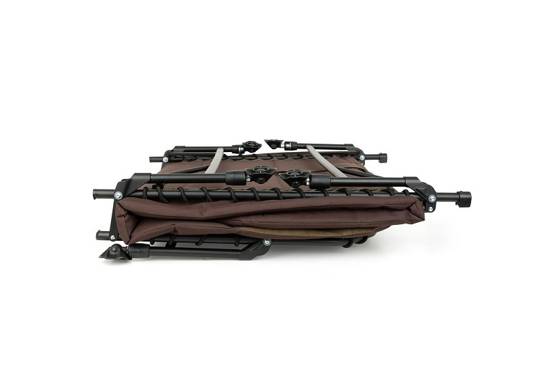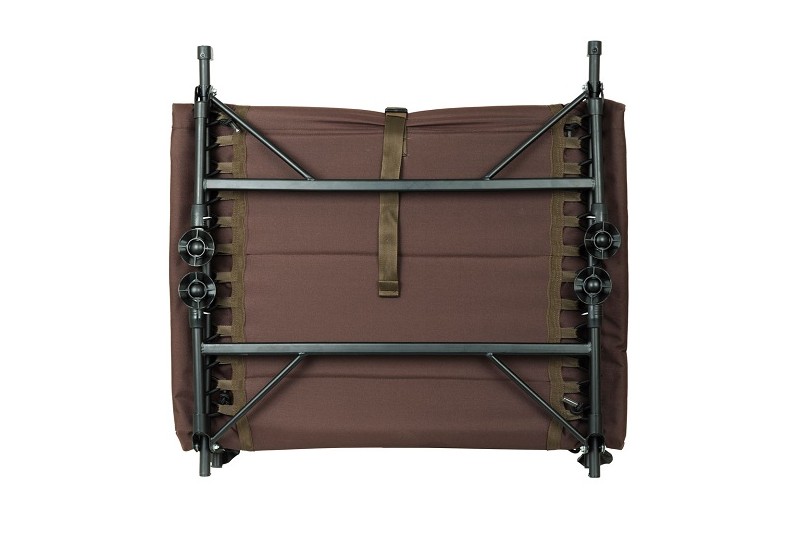 Strap and buckle system allows for bed to be packed away compact even with a sleeping bag on