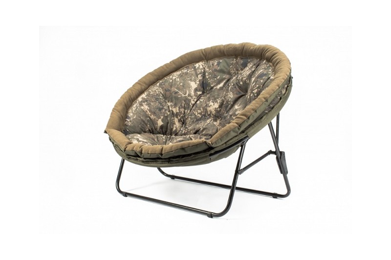 The Nash Indulgence Low Moon Chair low variant of the Moon Chair design, using the scissor action extra strength frame - folding flat for easy transport and tucking neatly under low profile shelters. Now also with the addition of twin mesh camo internal valuables pockets.