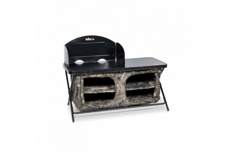 The Nash Bank Life Cook Station Camo is ideal for social sessions and cooking with some creativity the Bank Life Cook Station has a folding three sided windshield that drops in on pins to give you a windproof area for kettles and stoves and also prevents items being blown off the table top when used as a work surface...