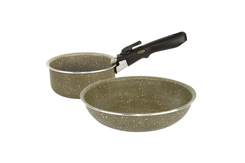 Comes supplied with a 16cmØ x 6.8cm saucepan, a 20cmØ x 5cm frying pan and a detachable handle.