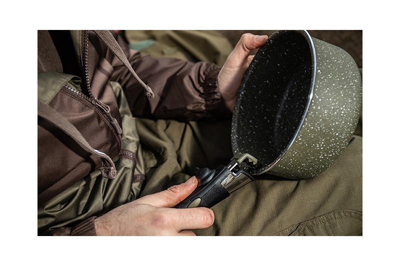 With three different options in the range, the Trakker Armolife Marble Cookset Compact have been developed to be extremely hard-wearing and are manufactured from a durable, two-layer marbled coating that brings professional grade, non-stick qualities to the bankside. Each pan has an extra-thick 2.5mm aluminium construction, with a stainless steel base boasting an embossed Icon logo. They are designed for use with a whole variety of heat sources at home and on the bank, and are finished in an olive-green colour with white and black flecks. Each set comprises a saucepan, frying pan and a detachable handle, which is compatible with all pans in the range, and has a twin-action safety catch to prevent any chance of accidental release when handling hot pans.