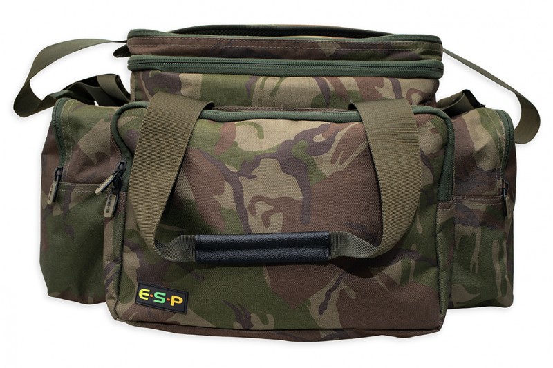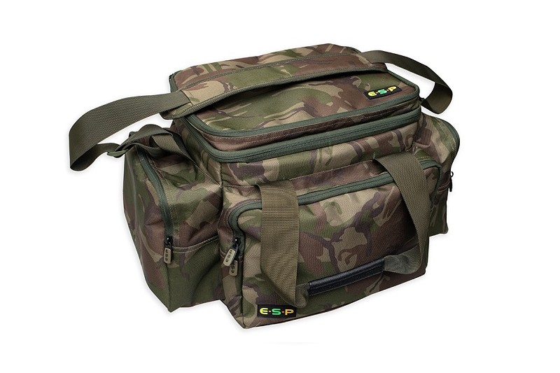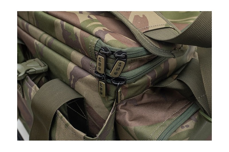 For the travelling light, short session/overnight angler, the ESP Camo Compact Carryall 35 Litre is a perfect size. Although compact, it can still accommodate a large amount of kit and features three roomy zipped external pockets. The front pocket comfortably fits any medium-sized plastic tackle box and the rear open topped pocket is ideal for storing spare clothing and/or carp sacks, while the zipped lid to the central compartment features a padded buzzer bar/short bankstick pocket so those essentials are to hand for a quick set-up.