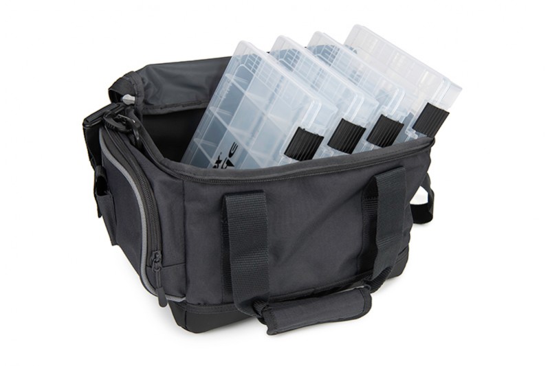 The Fox Rage Medium Lure Carryall is a top loading lure storage solution, with a main compartment loaded with 4 medium shallow boxes. Also has a rod holder on side of bag.