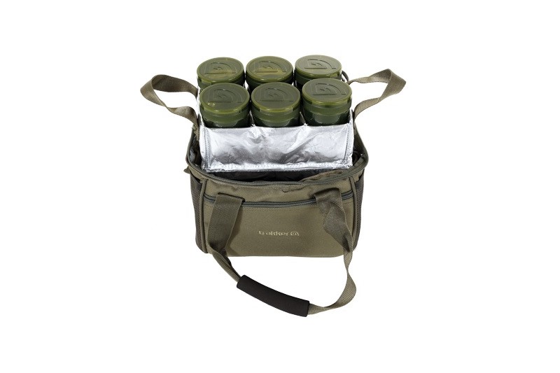 Perfect for keeping all of your favourite hookbaits in the same place, the Trakker NXG Bait Bag comes complete with six leakproof pots, housed in an insulated removable tray which allows you to easily store your choice of extra bait or tackle in the bottom which has a removable PVC inner that can be easily cleaned. Featuring netted side and a zipped front pocket, you can safely store extra items such as PVA bags and other small tackle items. Manufactured from 600-denier polyester in a subtle olive green, it has neoprene covered carry handles, making transportation simple.
